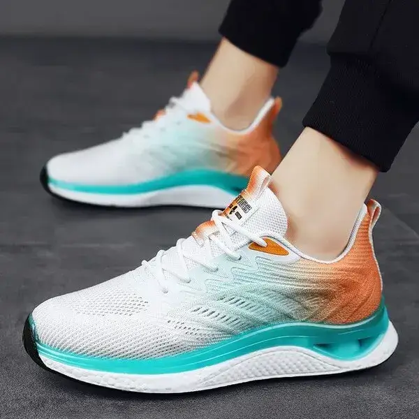- Stylish Gradient Pattern with Sporty Accents:Gradient design in White Blue, White Orange, and Black with sporty accents and "FASHION AIR" branding offers a trendy, athletic look.